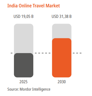 In 2025, the Indian online travel market is estimated to reach USD 19.05 billion, with projections indicating robust growth to USD 31.38 billion by 2030, with a CAGR of 10.5% over the forecast period