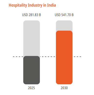 India’s hospitality industry has entered a robust growth phase in FY2025, driven by the resurgence of both domestic and international travel, rising disposable incomes and the growing preference for leisure and spiritual tourism. The market size reached to USD 281.8 billion in 2025 and is expected to grow at a strong 13.96% CAGR to USD 541.7 billion by 2030. This impressive growth is supported by a surge in domestic tourism, a rebound in business travel, rising disposable incomes and significant government-led infrastructure development