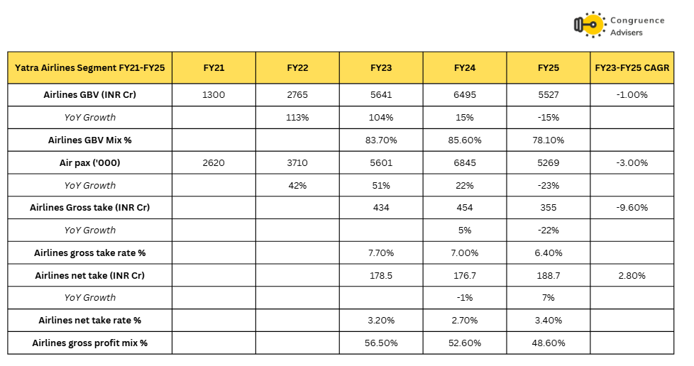Hotels – This is by far the more profitable business segment for Yatra Online Ltd While Hotels contributed only ~19% of Yatra Online Ltd’s FY25 GBV, it contributed ~29% of Yatra Online Ltd’s gross profit in FY25. The Hotels segment had a net take rate % of 8.6% in FY25 versus Air’s 3.4% highlighting the difference in profitability.