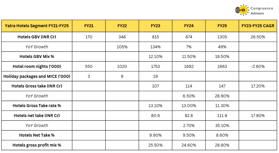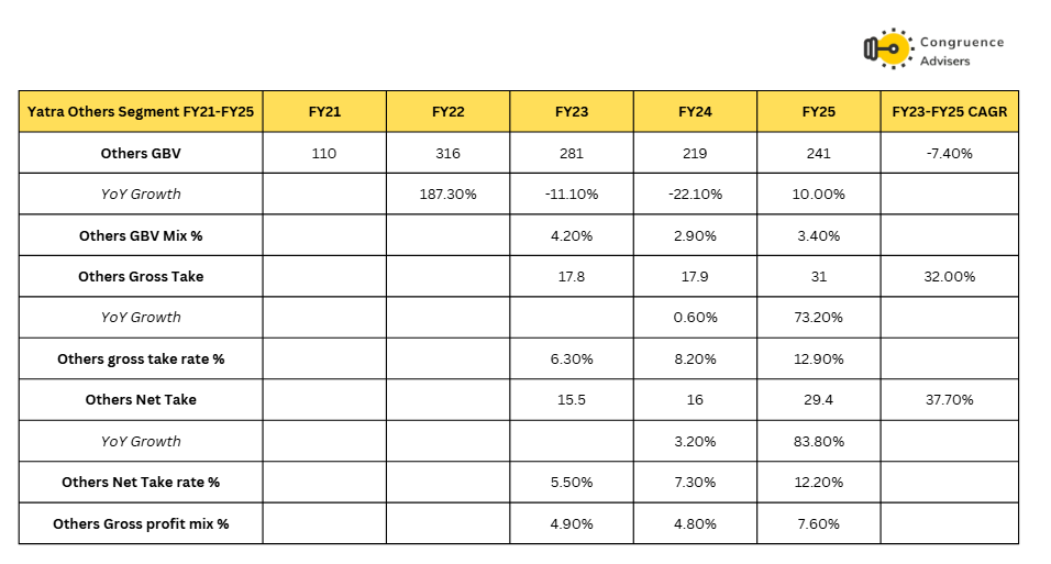 About 30-35% of the Hotels GBV comes from MICE business, which started in earnest only in FY25. That’s why GBV has increased by 49% in FY25 whereas hotel room nights haven’t increased at all. Most of the Hotels GBV growth in FY25 seems to have come from hotel ADR (Average daily rate) hikes and MICE business. While this is great execution on the MICE front by Yatra Online Ltd, hotel room nights staying flat YoY for 2 FYs straight is not good news and needs to be monitored closely.