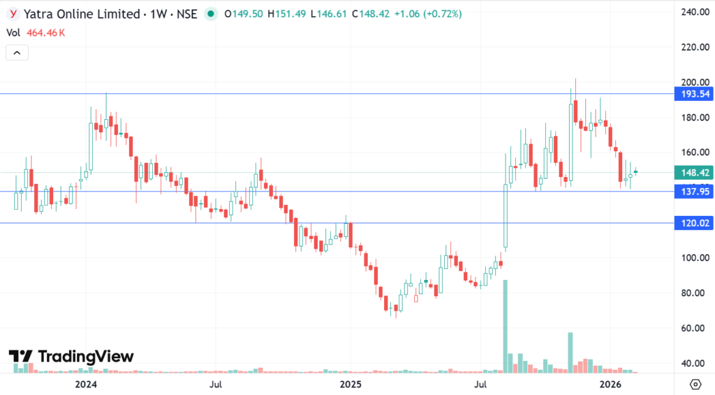 After making an intermediate top in Sep 2024, Yatra Online Ltd stock had a terrible next 6-8 months along with the broader Indian market. Yatra Online Ltd stock started coming off lows in March 2025 and then caught on fire after blockbuster Q1 FY26 results, followed by a solid Q2 FY26. From bottom to top, Yatra Online Ltd stock went up 170% between March 2025 and Nov 2025. Since then, Yatra Online Ltd stock has corrected 30-35%, again in line with the broader markets.