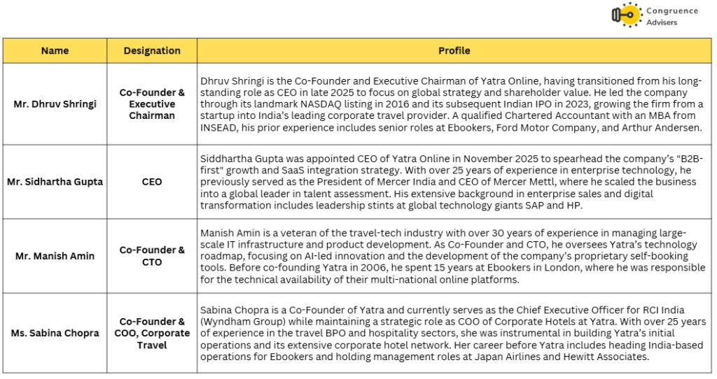 - Leadership Transition (Nov 2025): Dhruv Shringi moved to Executive Chairman; Siddhartha Gupta took the helm as CEO of Yatra Online Ltd