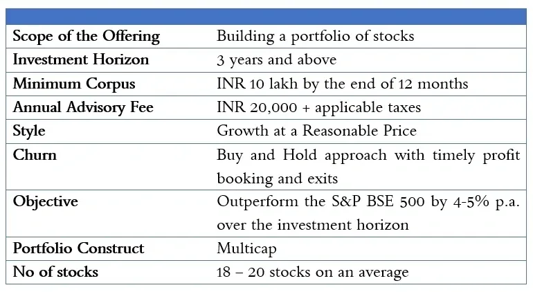 We are a Research Analyst firm whose primary skill set is a deep understanding of businesses and expressing a view on valuation. The objective of the model portfolios we offer is to outperform the S&P BSE 500 by 4-5% p.a. over the investment horizon (3-5 years). Please note that there are no guaranteed returns on offer, the equity market is a fickle beast that can reward you well if you can play the game right.